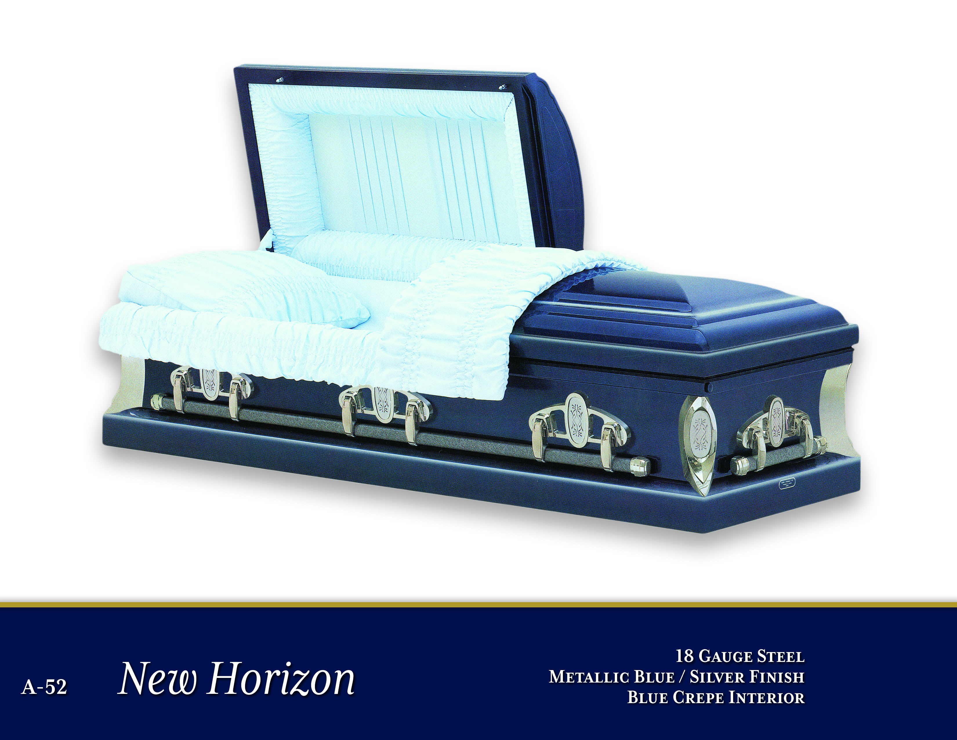 A-52 New Horizon$3,195.00Price18 Gauge SteelMetallic Blue/Silver FinishBlue Crepe InteriorOpen Shareable Image