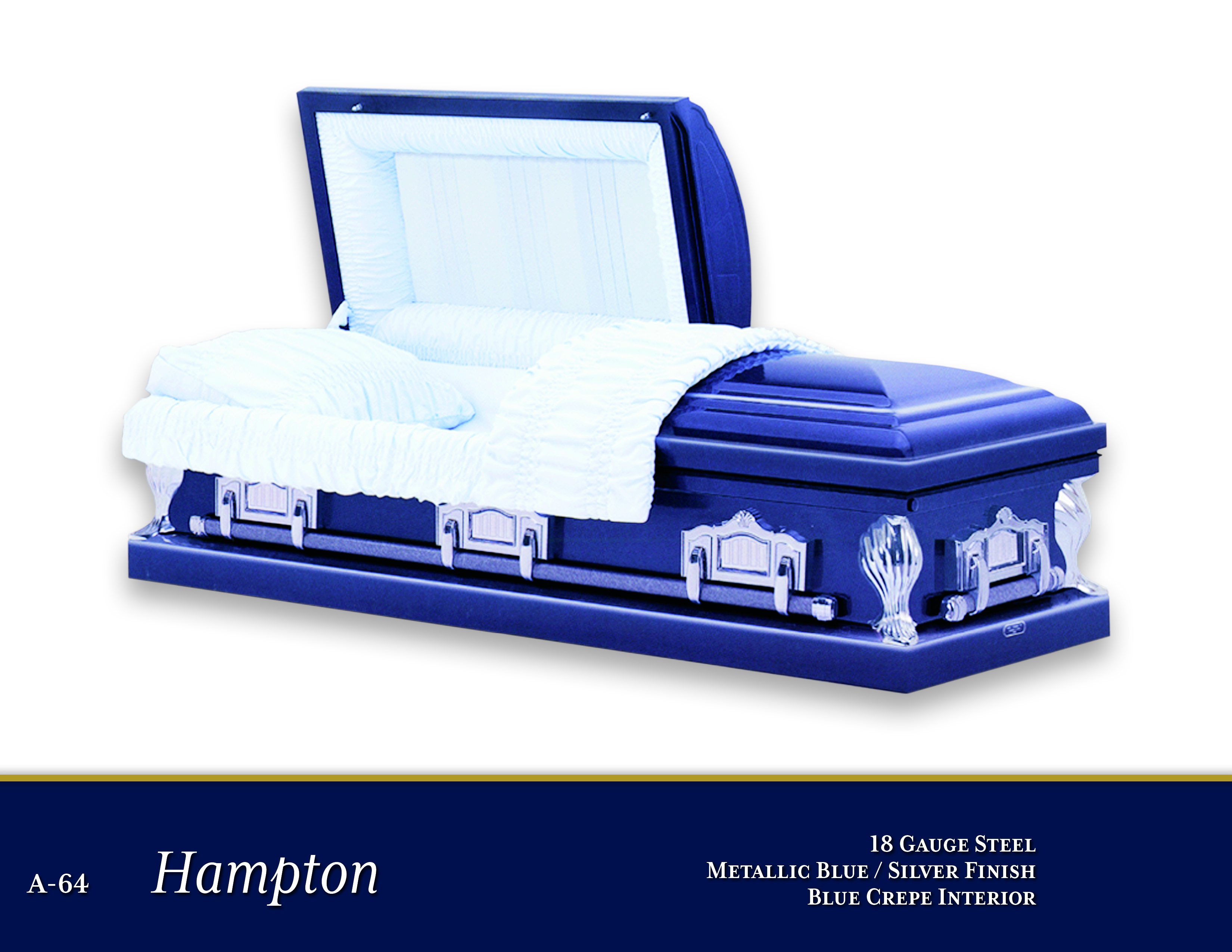 A-64 Hampton$3,195.00Price18 Gauge SteelMetallic Blue/Silver FinishBlue Crepe InteriorOpen Shareable Image