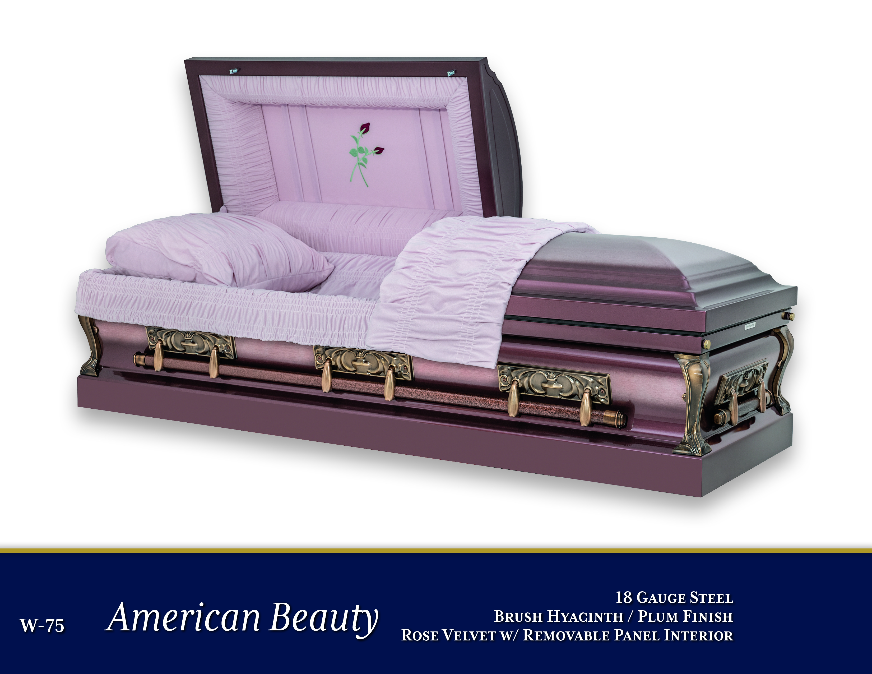 W-75 American Beauty$5,150.00Price18 Gauge SteelBrush Hyacinth/Plum FinishRose Velvet Interior w/Removable PanelOpen Shareable Image